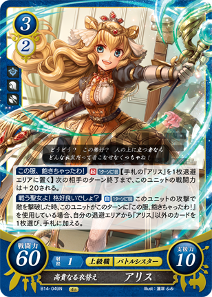 "I grow weary of this outfit!" [Send 1 "Alice" from your hand to the Retreat Area] Until the end of your opponent's next turn, this unit gains +20 attack. |