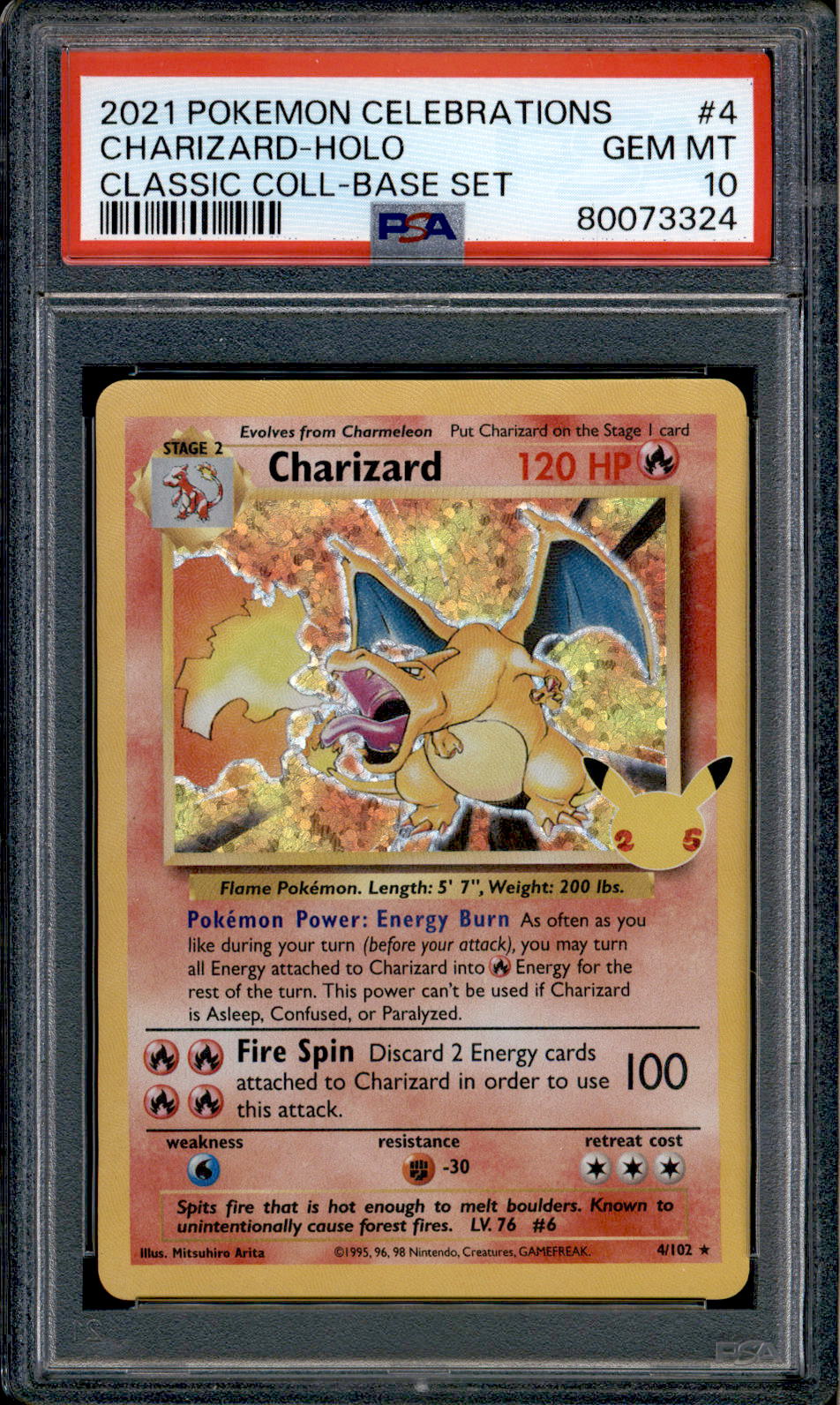 Charizard - 4/102 - PSA 10 - Holo - Celebrations - Pokemon - 73324 VendorPSA Share WhatsApp Deel Tweet Pin it Messenger Email Charizard - 4/102 - PSA 10 - Holo - Celebrations - Pokemon - 73324 VendorPSA Share WhatsApp Deel Tweet Pin it Messenger Email Product form Condition: PSA Graded Out of stock $185.00 Quantity Out of stock This item is a recurring or deferred purchase. By continuing, I agree to the cancellation policy and authorize you to charge my payment method at the prices, frequency and dates listed on this page until my order is fulfilled or I cancel, if permitted.