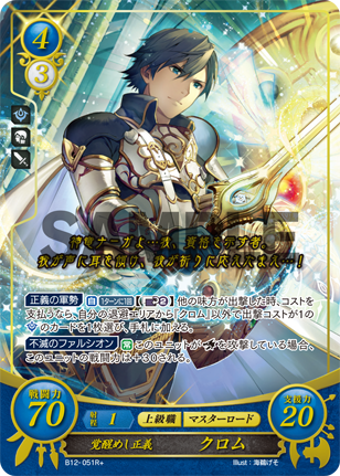 Army of Justice [ ] When another ally is deployed, you may pay the cost and if you do: Choose 1 non-"Chrom" card with a Deployment Cost of 1 from your Retreat Area, and add it to your hand. |