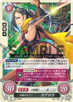 Crisp Breathing When this unit is deployed using "Ninjutsu Emblem", you may choose 1 "Saizo" with a Deployment Cost of 1 from your Retreat Area and deploy that unit tapped. |