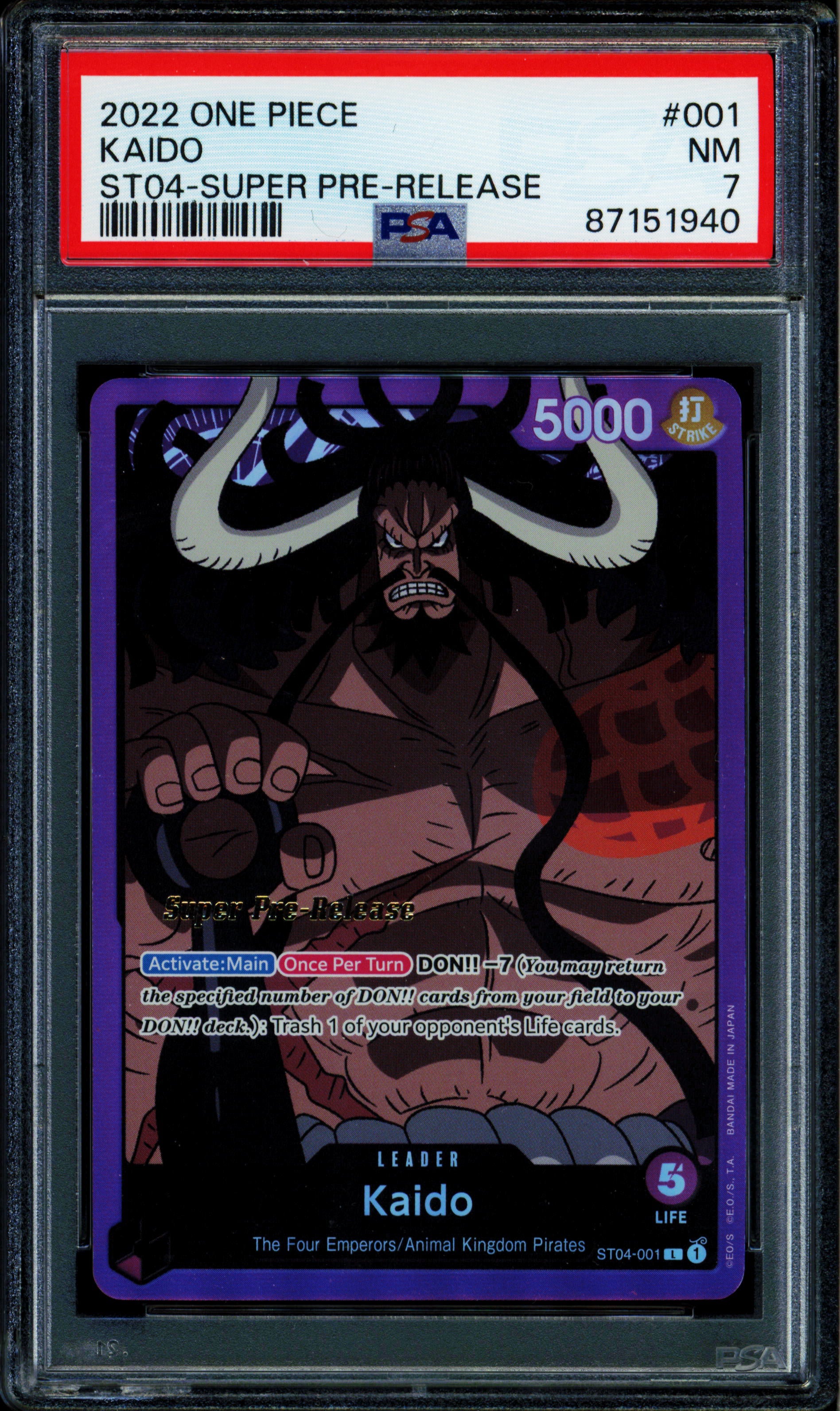 Get yourself this, Kaido - ST04-001 - PSA 7 - Alt Art - Super Pre-Release - One Piece - 519, an amazing PSA Graded card at an affordbale price. PSA is a professional grading company that specializes in authenticating and grading your trading and sports cards. Cards are graded on a scale of 1-10 using a tamper proof case to protect them. Certification number may vary due to multi-quantity listing. You will get a card of matching grade.