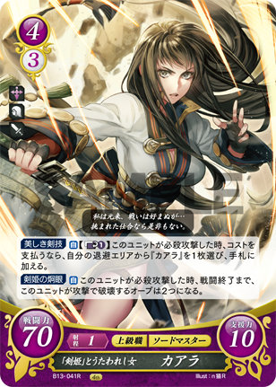 Beautiful Swordplay [ ] When this unit inflicts a Critical Hit, you may pay the cost and if you do: Choose 1 "Karla" from your Retreat Area, and add it to your hand. |