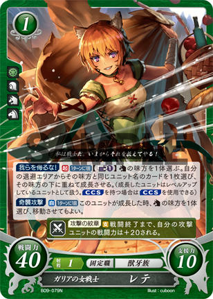 "Do not insult us!" [ ] Choose 1 ally. Choose 1 card with the same Unit Name as that ally in your Retreat Zone, and stack it underneath that unit to Growth them. (A unit who has Growthed is treated as if they are Leveled Up. If they possess a , they are able to use it.) |