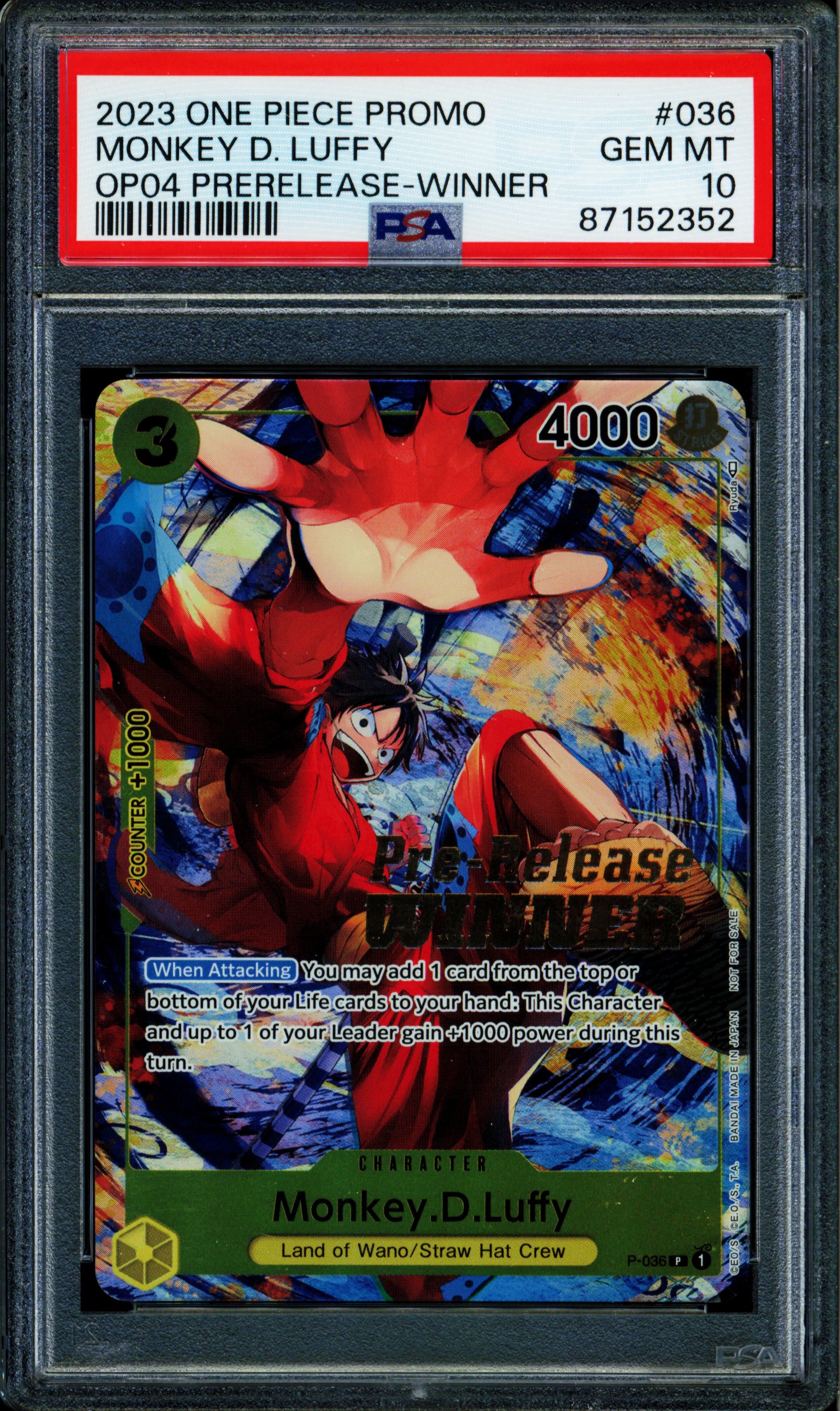 Monkey D Luffy - P-036 - PSA 10 - Pre-Release Winner - English - One Piece - 523 VendorPSA Share WhatsApp Deel Tweet Pin it Messenger Email Last stock! Monkey D Luffy - P-036 - PSA 10 - Pre-Release Winner - English - One Piece - 523 VendorPSA Share WhatsApp Deel Tweet Pin it Messenger Email Product form Condition: PSA Graded 1 in stock $600.00 Quantity Add to cart This item is a recurring or deferred purchase. By continuing, I agree to the cancellation policy and authorize you to charge my payment method at the prices, frequency and dates listed on this page until my order is fulfilled or I cancel, if permitted.
