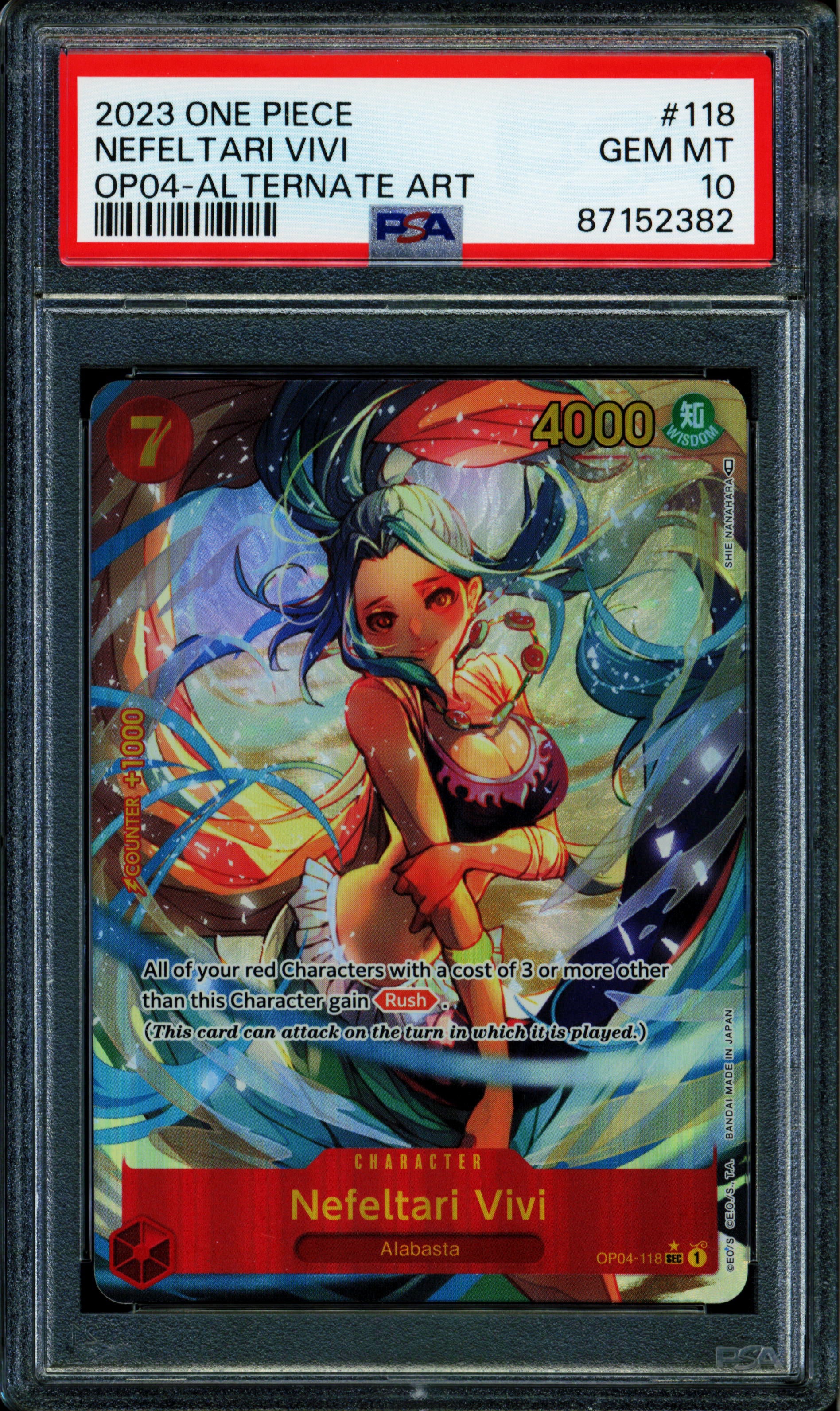 Get yourself this, Nefeltari Vivi - OP04-118 - PSA 10 - Alt Art - English - One Piece - 523, an amazing PSA Graded card at an affordbale price. PSA is a professional grading company that specializes in authenticating and grading your trading and sports cards. Cards are graded on a scale of 1-10 using a tamper proof case to protect them. Certification number may vary due to multi-quantity listing. You will get a card of matching grade.