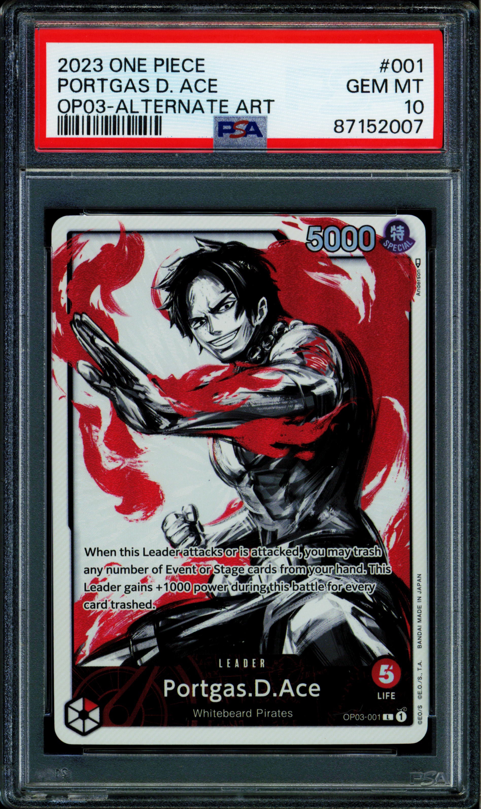 Get yourself this, Portgas D Ace - OP03-001 - PSA 10 - Alt Art - English - One Piece - 520, an amazing PSA Graded card at an affordbale price. PSA is a professional grading company that specializes in authenticating and grading your trading and sports cards. Cards are graded on a scale of 1-10 using a tamper proof case to protect them. Certification number may vary due to multi-quantity listing. You will get a card of matching grade.