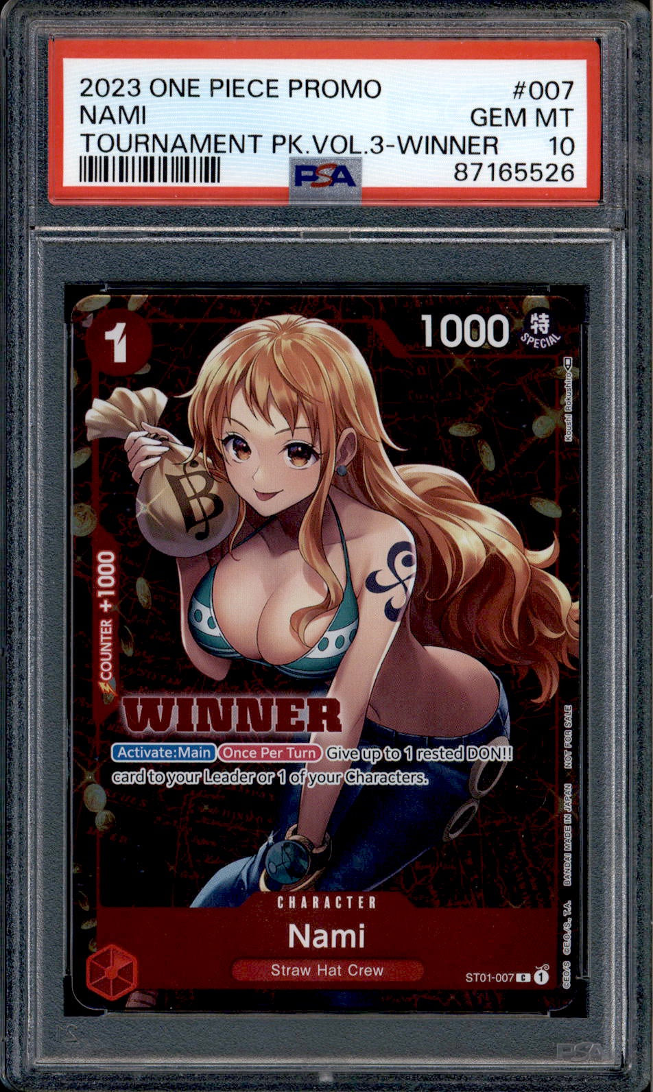 Get yourself this, Nami - ST01-007 - PSA 10 - Winner - English - One Piece - 655, an amazing PSA Graded card at an affordbale price. PSA is a professional grading company that specializes in authenticating and grading your trading and sports cards. Cards are graded on a scale of 1-10 using a tamper proof case to protect them. Certification number may vary due to multi-quantity listing. You will get a card of matching grade.