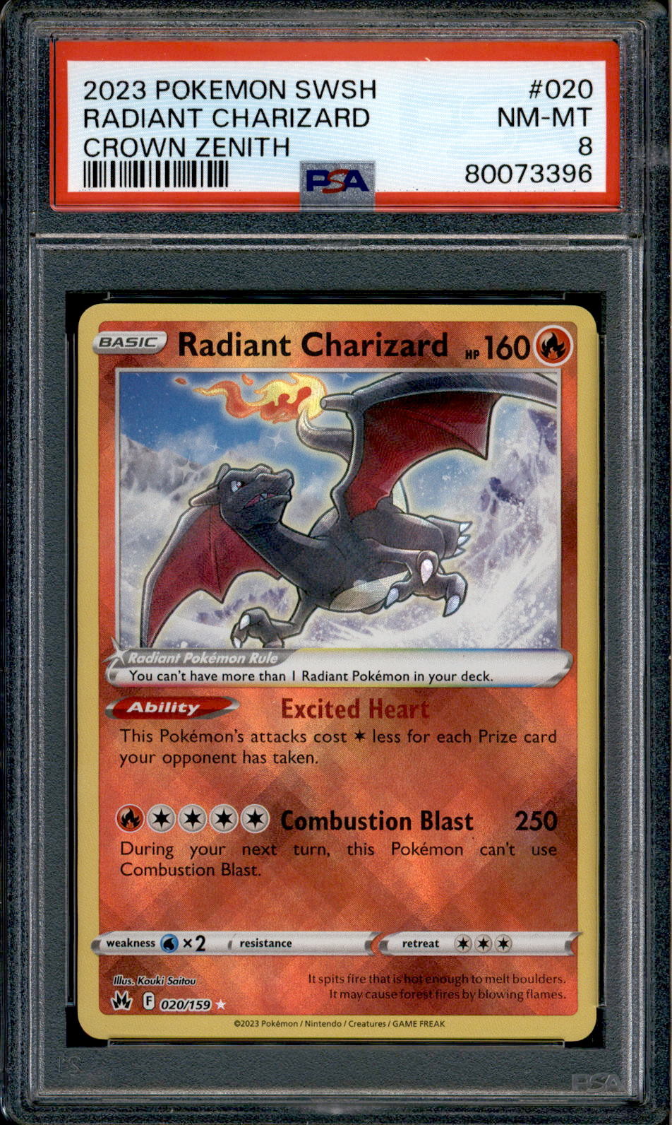 Radiant Charizard - 020/159 - PSA 8 - Holo - Crown Zenith - Pokemon - 73396 VendorPSA Share WhatsApp Deel Tweet Pin it Messenger Email Radiant Charizard - 020/159 - PSA 8 - Holo - Crown Zenith - Pokemon - 73396 VendorPSA Share WhatsApp Deel Tweet Pin it Messenger Email Product form Condition: PSA Graded Out of stock $20.00 Quantity Out of stock This item is a recurring or deferred purchase. By continuing, I agree to the cancellation policy and authorize you to charge my payment method at the prices, frequency and dates listed on this page until my order is fulfilled or I cancel, if permitted.