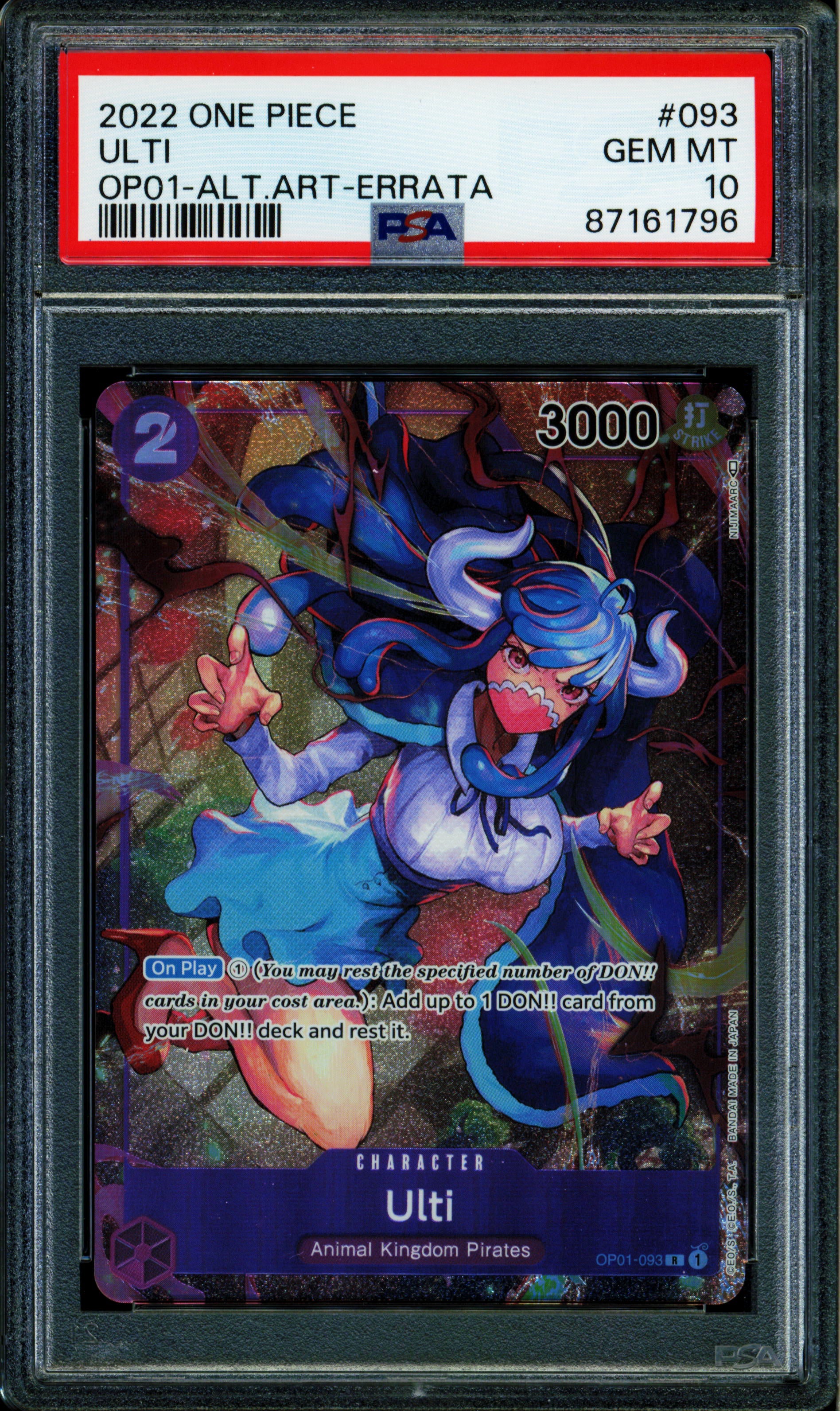 Ulti (Errata) - OP01-093 - PSA 10 - Alt Art - OP01 - One Piece - 61796 VendorPSA Share WhatsApp Deel Tweet Pin it Messenger Email Last stock! Ulti (Errata) - OP01-093 - PSA 10 - Alt Art - OP01 - One Piece - 61796 VendorPSA Share WhatsApp Deel Tweet Pin it Messenger Email Product form Condition: PSA Graded 1 in stock $80.00 Quantity Add to cart This item is a recurring or deferred purchase. By continuing, I agree to the cancellation policy and authorize you to charge my payment method at the prices, frequency and dates listed on this page until my order is fulfilled or I cancel, if permitted.