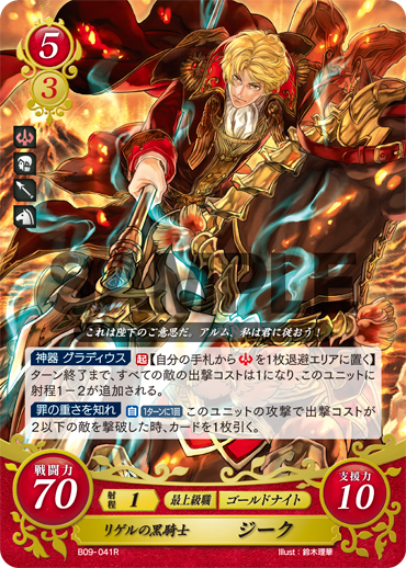 Regalia: Gradivus [Send 1 card from your hand to the Retreat Area] Until the end of the turn, the Deployment Cost of all enemies becomes 1, and this unit acquires range 1-2. |